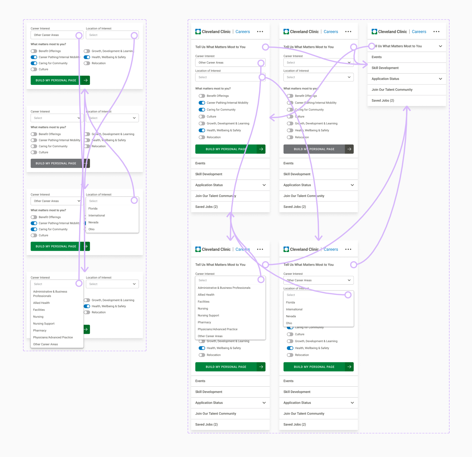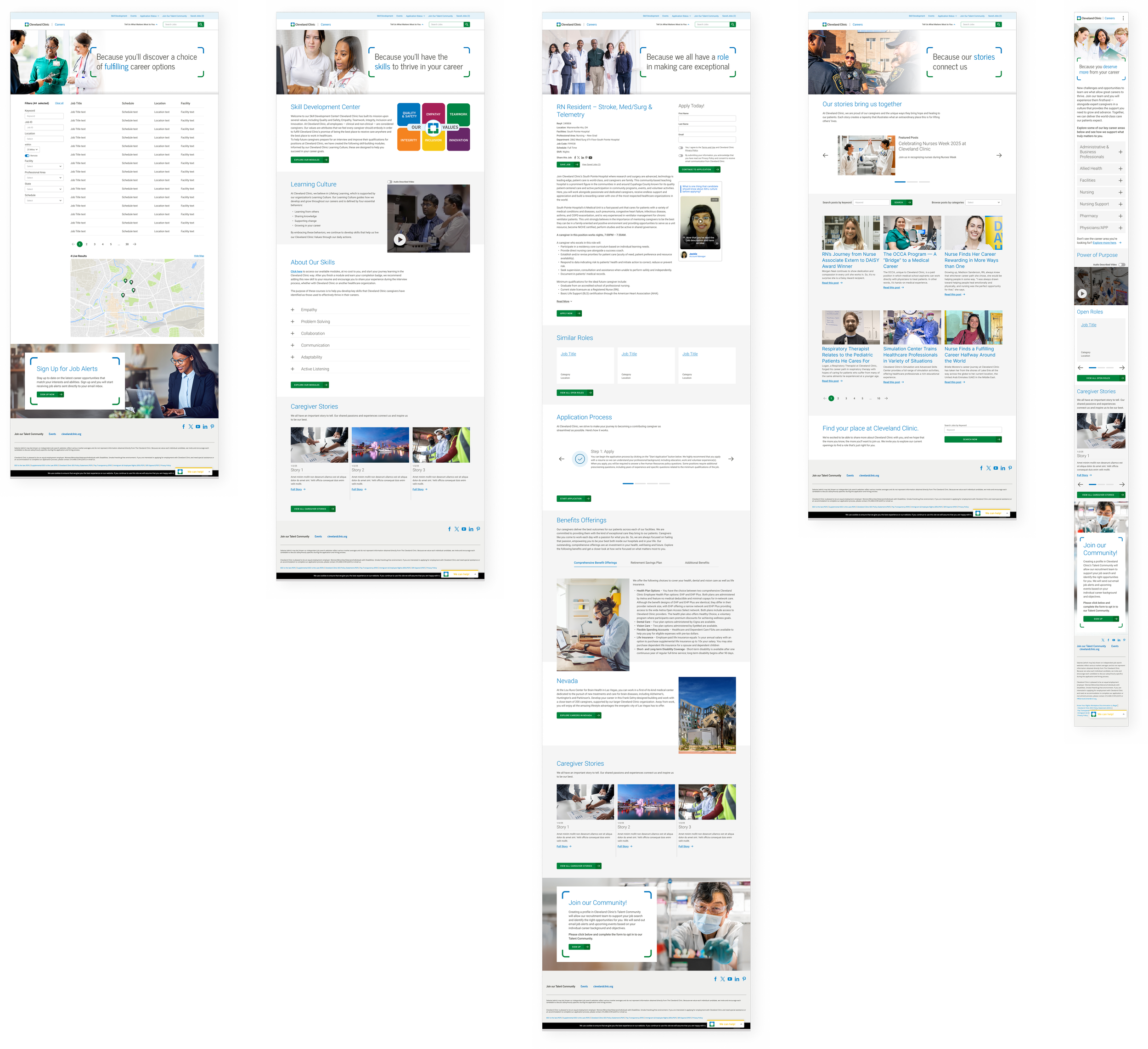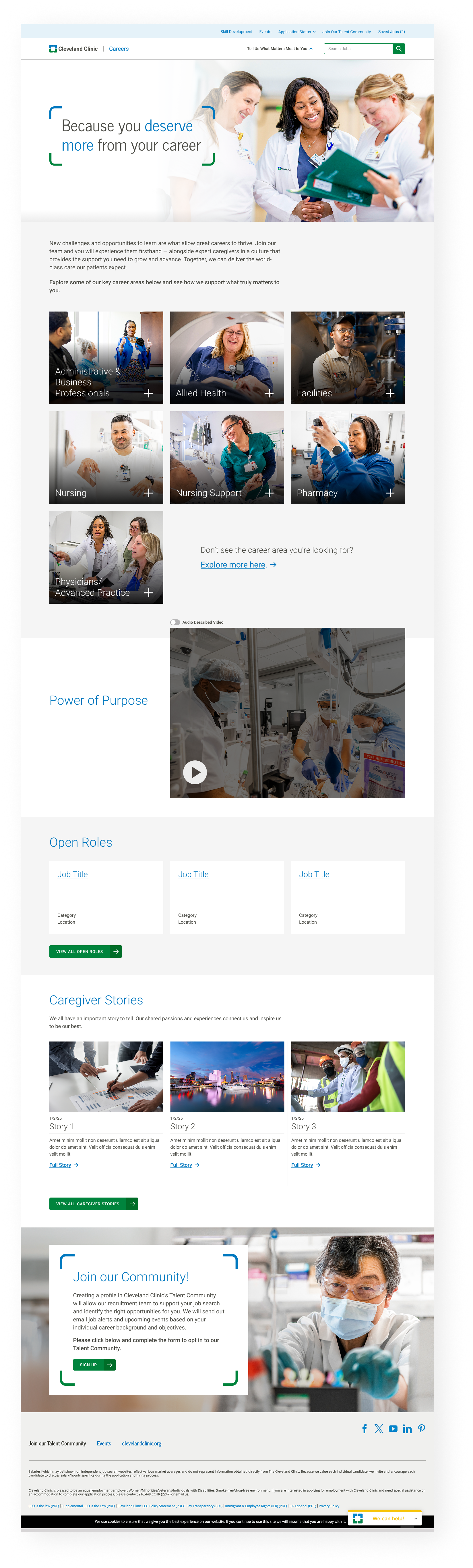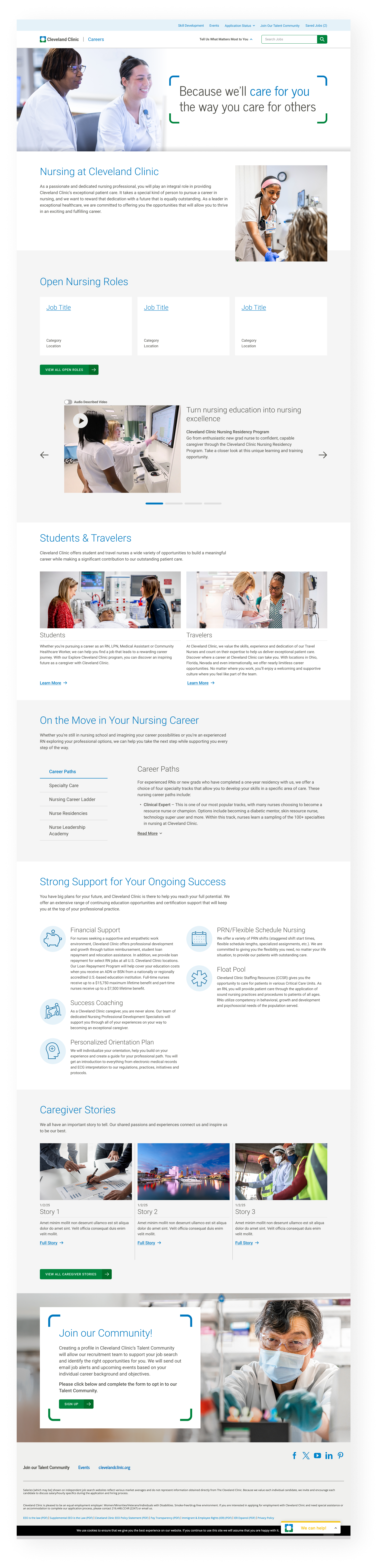 Cleveland Clinic's careers website overwhelmed users with massive healthcare content across dozens of professional areas. As lead UX/UI designer, I created a personalization strategy that immediately segments users by career interests and motivators, then displays dynamic persona pages with only relevant content. The result: a scalable system that transforms information overload into personalized career discovery.