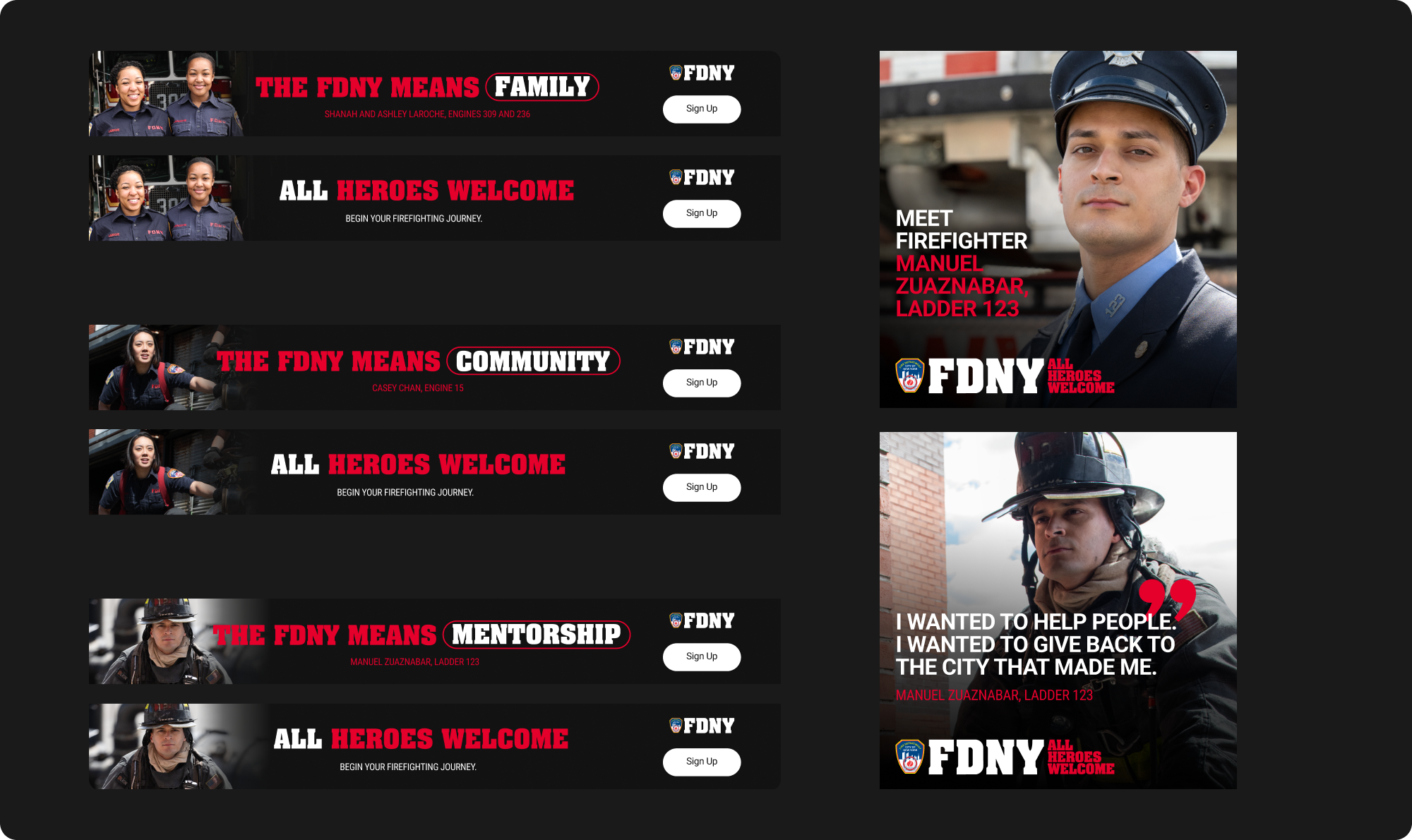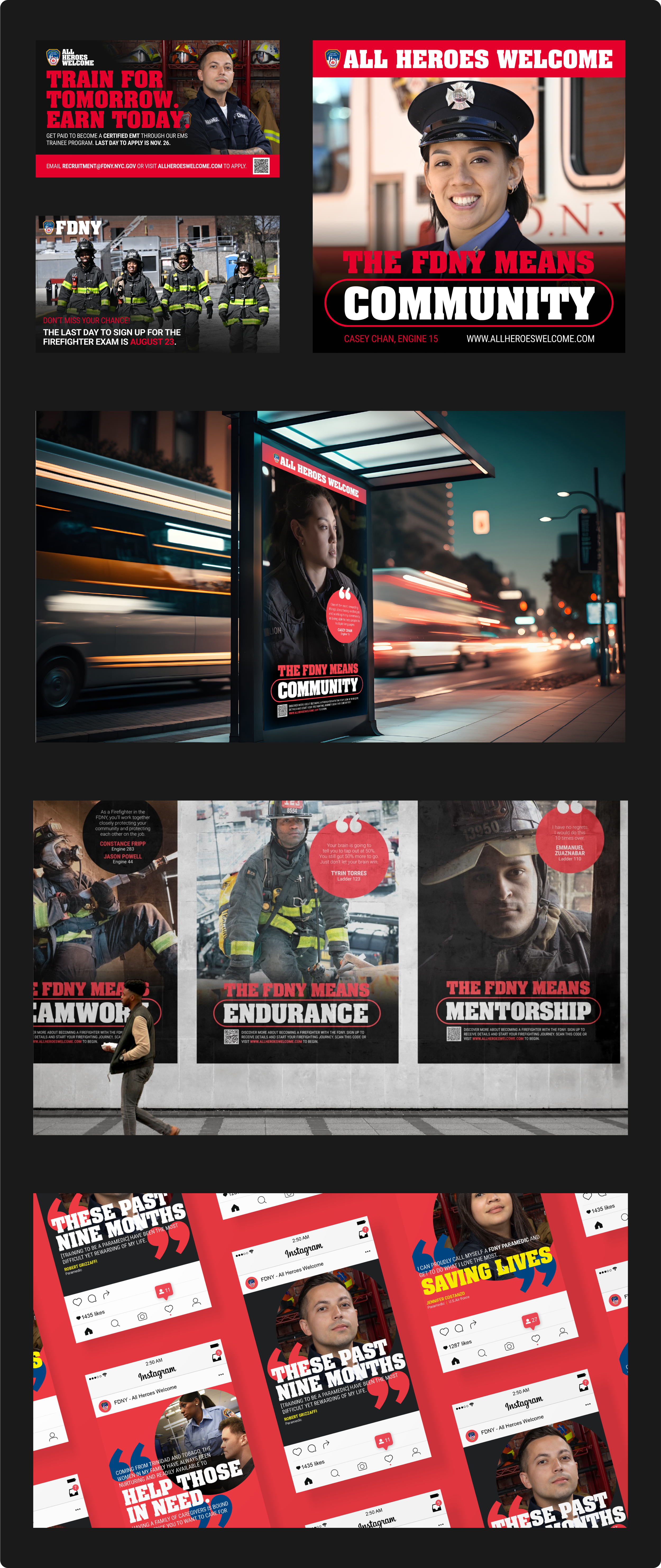 The slogan “All Heroes Welcome” powerfully reinforces the campaign’s message of inclusion, showing that bravery knows no gender, race, or background. Using the tagline “The FDNY means ____” allowed each ad to highlight a personal value—like endurance or resilience—making the message relatable and tailored to the individual featured.