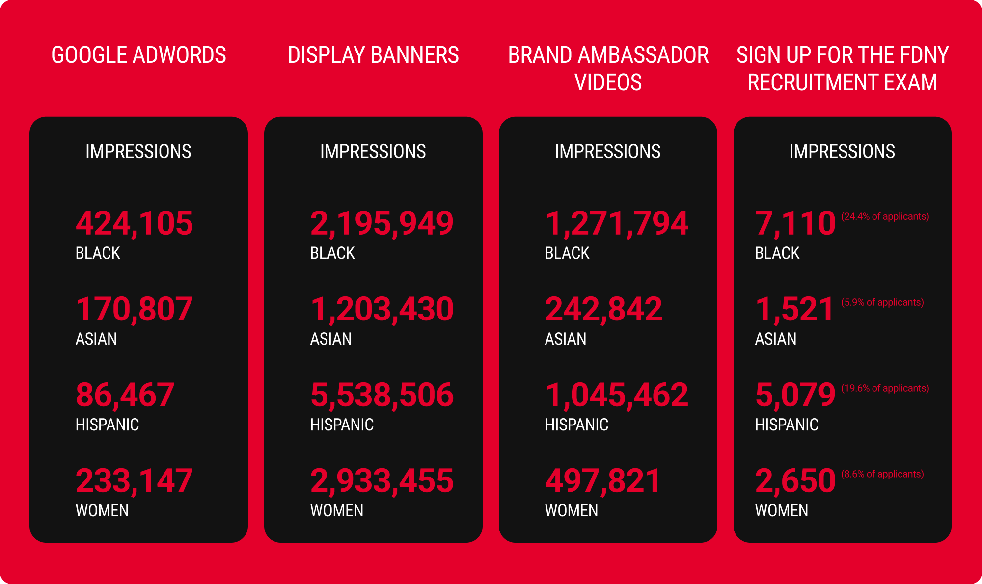 The combination of brand awareness, targeted recruiting, and smart remarketing drove real results and transformed interest into action. FDNY’s diversity recruitment efforts surged, achieving short- and long-term goals while strengthening its reputation as an inclusive employer and building a diverse pipeline of future firefighters.